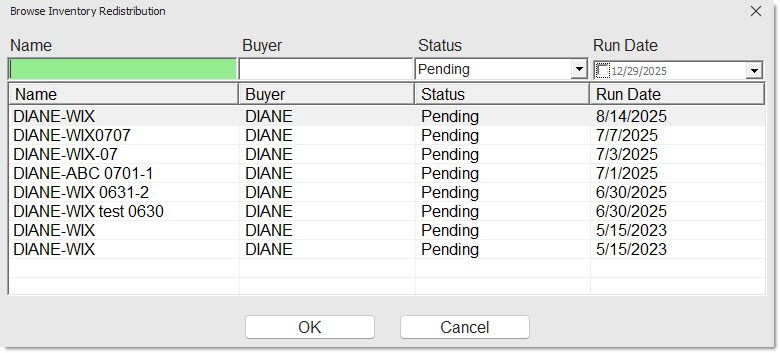 Click 'Name'. The 'Browse Inventory Redistribution' window displays.