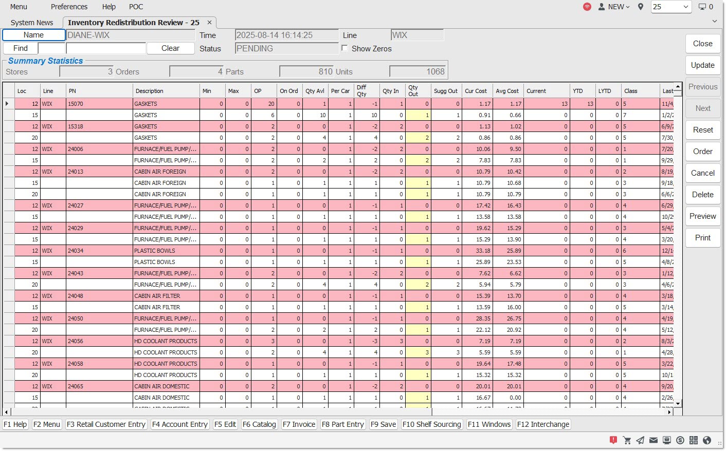 The Inventory Redistribution Review screen is used to review the selected results of the criteria that was run in the Inventory Redistribution Setup screen, allow suggested quantities to be edited before the 'Order' button is clicked to generate the purchase orders.