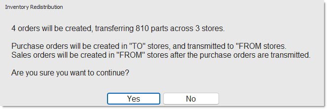 Click 'Yes' to begin creating orders. Click 'No' to return to the Inventory Redistribution Review screen without creating orders.