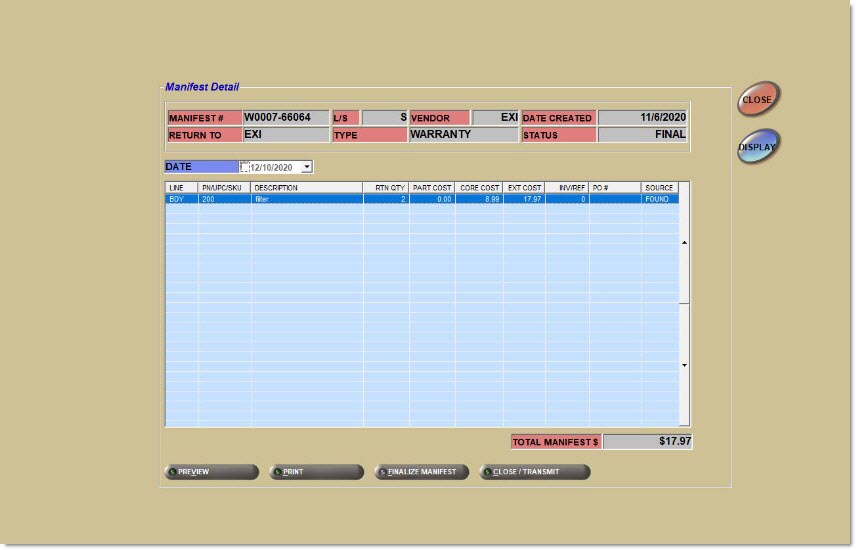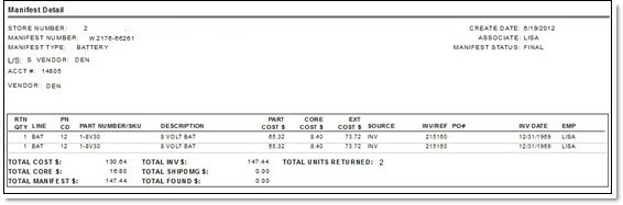 A manifest is a process used to return all non-resellable core and defective (warranty) items returned at Point-of-Sale, any sourced items purchased from a non-company-owned vendor, or any items manually input by the user back to the supplying vendor.