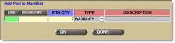 Enter the values in the 'Line', 'PN/SKU/UPC', 'Rtn Qty' and 'Type' fields. The 'Description' field displays the description of the part that is being added to and is grayed out. Click 'Ok' to add the item to the manifest as a found part. Found parts manually added to a Core manifest do not decrease inventory. Found parts manually added to a Warranty and a Labor Claim manifest decrease inventory and are tracked to the Part Ledger to reflect a change in the stock for Warranty and Labor Claim manifests. These found parts do not reflect a change in the stock quantity for Core manifests. The system tracks the correct credit code for the manifest that the found part is added to for transmission to the warehouse. Found parts added to a manifest have the same credit code as the manifest it is added to. This ensures all parts on a manifest are sent in one transmission.