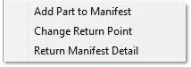 By right-clicking the list, besides adding a part to the manifest, the Return Point can be changed and the Return Manifest Detail can be opened.