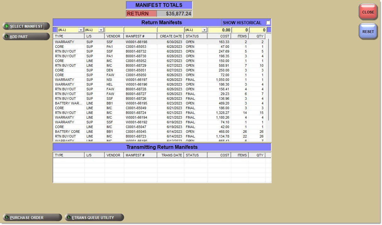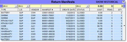 A manifest is a list of returned core and warranty items automatically added from Point-of-Sale and manually added from the shelf. When creating a new manifest, the vendor record is read ('Mfg' or 'Sup') as well as the vendor Return Point. If the Return Point vendor has a 'PO Cost Level' set, the manifest is created with that cost level. If 'PO Cost Level' is set to 'Not Selected', the manifest is created using 'Current Cost'.