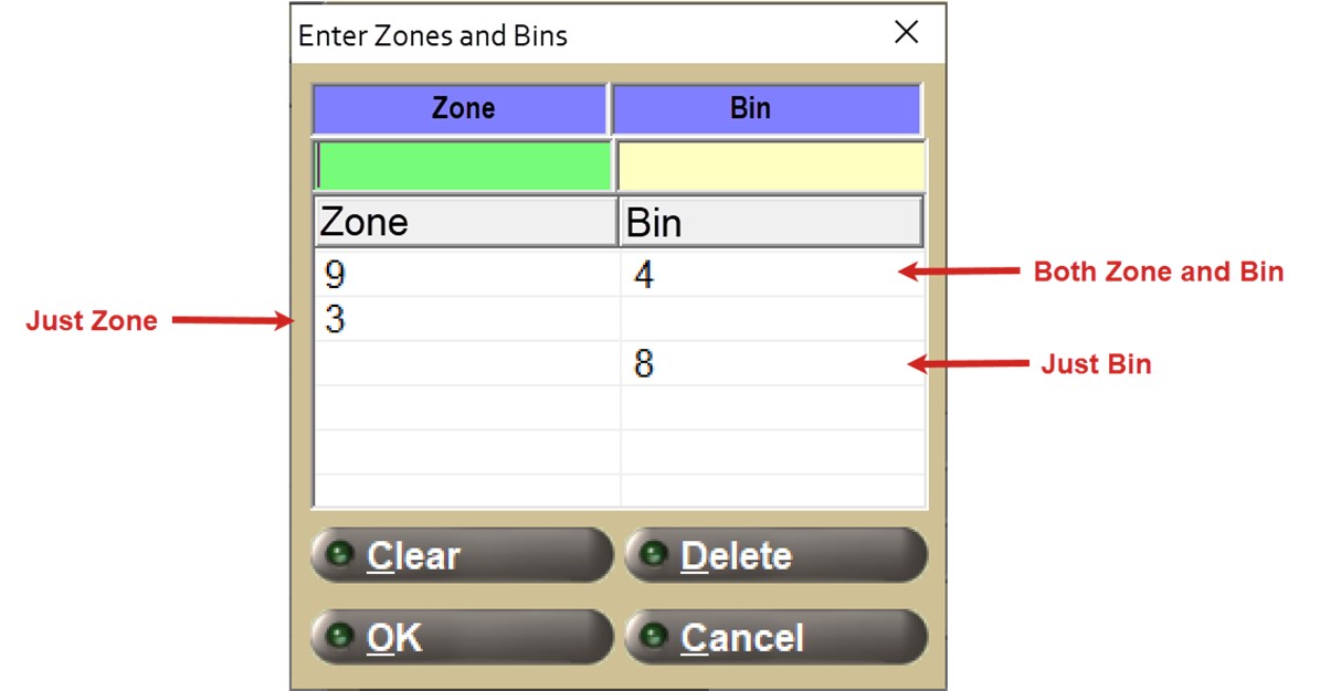 Note: The system will not do any validation that a specific zone, bin, or zone/bin combination exists in the system.