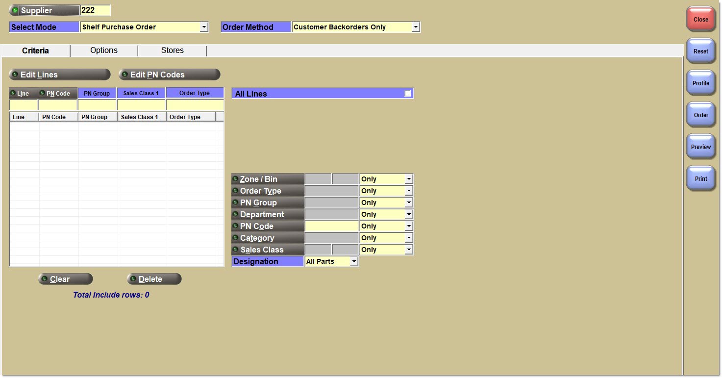 The 'Criteria' tab is used to identify the parts that will be considered for the order (for the selected Line Codes), and to filter the parts across the Lines to narrow the list of parts ordered.