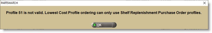 If a 'Select Mode' other than 'Shelf Purchase Order' is selected, the system prompts: "Profile <ID> is not valid. Lowest Cost Profile ordering can only use Shelf Replenishment Purchase Order profiles."