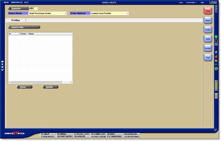 Note: Before running the 'Lowest Cost Profile' order, Profiles must first be set up and saved.