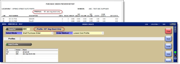 It is important to correctly set up and save Profiles for 'Lowest Cost Profile' Ordering using the same Criteria, Options, Sales History Periods, and Stores for different 'Suppliers' so that the system can compare the results of each supplier to find the one with the lowest cost.