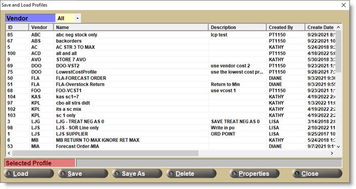 - Double-click a selection or highlight a row and click the 'Load' button to select that profile. Repeat the process for each 'Supplier' to be compared for the order.