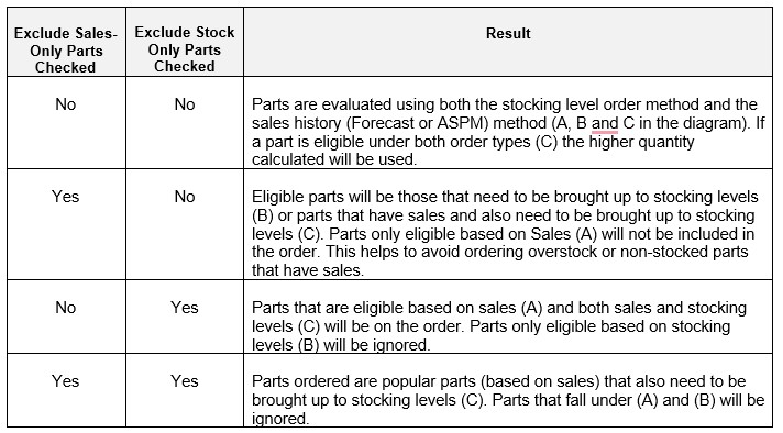 - If the "Stocking" method used should be the primary method, check the 'Exclude Sales Only Parts' option, and leave the 'Exclude Stock Only Parts' option unchecked. This setting combination will avoid ordering "overstock" or "non-stocked" parts that have sales.
