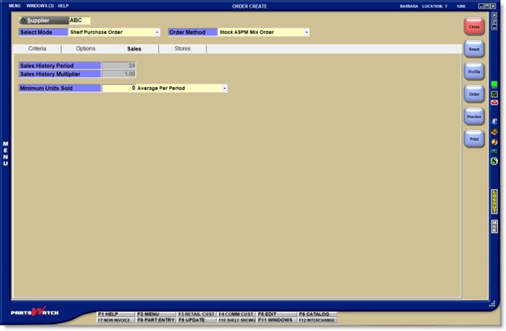 For example: if a part has 0 'QTY AVAILABLE' and an 'ORDER POINT' of '5', when an 'Order to Order Point' method is used, the system will order a quantity of 5 for the part. However, if the part is popular, and sales based on historical data determine that an average of 8 parts were sold within the designated period, 8 parts would be ordered if only a sales-based method is used. With a mix method, both purchase orders are compared and the one with the higher quantity for the part is the one which will be ordered. In this example, 8 parts would be on the mix order.