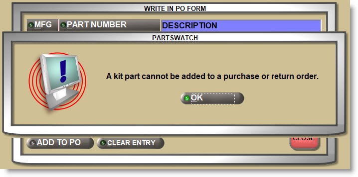 Attempting to add a kit part to a 'Write-In' Order or 'Write-In' Return displays a prompt stating that kit parts cannot be added.