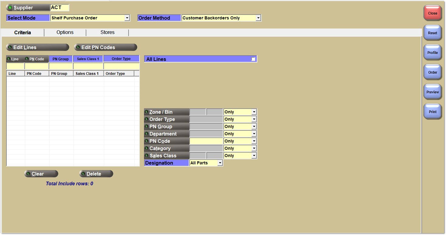 - 'Criteria' Tab - Optionally edit Lines ordered for the selected 'Supplier'/select part filter criteria to narrow the parts considered for the order.