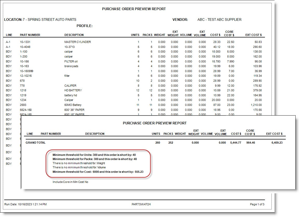 The purpose of the report is to assist in determining whether an order has met vendor 'Minimum Thresholds' without actually having to create the order.