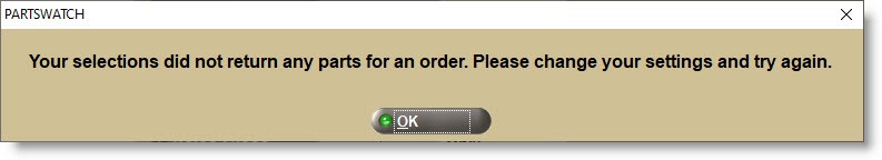If no results are found, a prompt opens notifying that no parts were ordered and to change the settings before trying again.