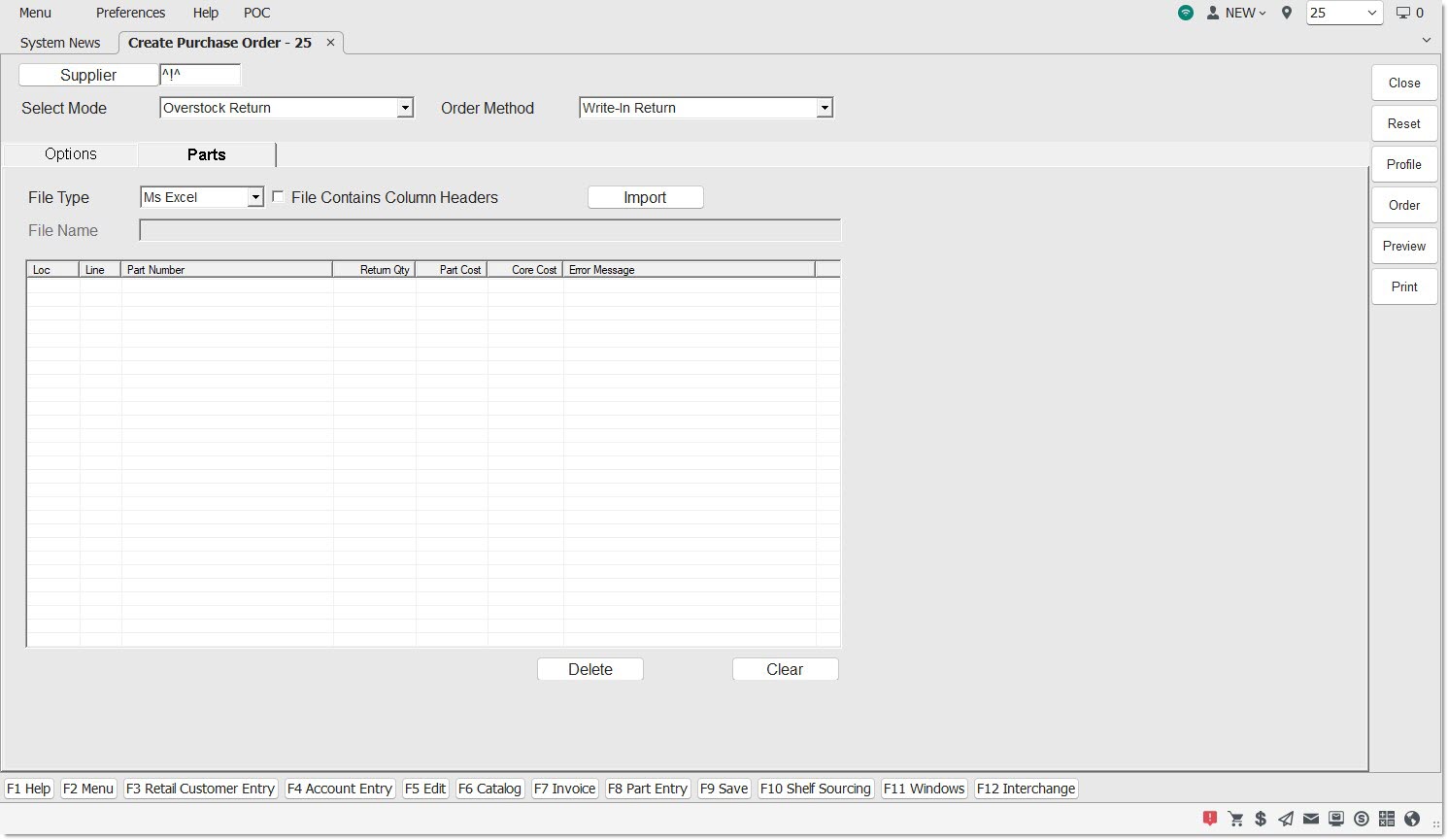 The 'Parts' tab is used to import a PO or RO from a file, such as a spreadsheet.
