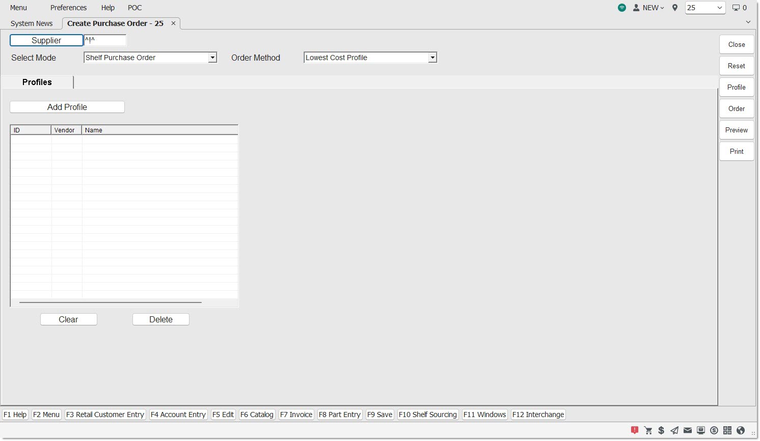 Note: All selected profiles will be compared (in the background) and evaluated for which one has the lowest, non-zero cost overall, and then the system will create one purchase order with the lowest overall cost.