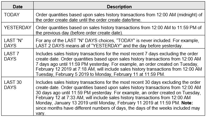 However, a Day Sales order allows a dynamic sales history period (up to the last 30 days) to be defined while a Replenishment order uses a static sales history period between the date of the last Replenishment order and the date of the new Replenishment order.