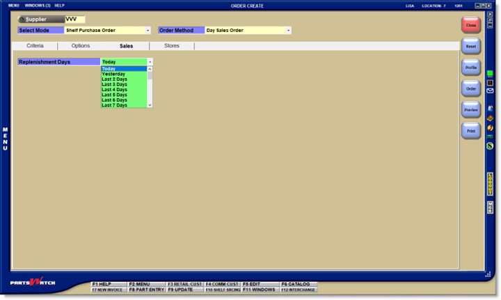 Day Sales orders, similar to Replenishment orders, which order only quantities sold, set part order quantities based upon the number of units sold within a sales history period. The sales history period is typically in days instead of months.