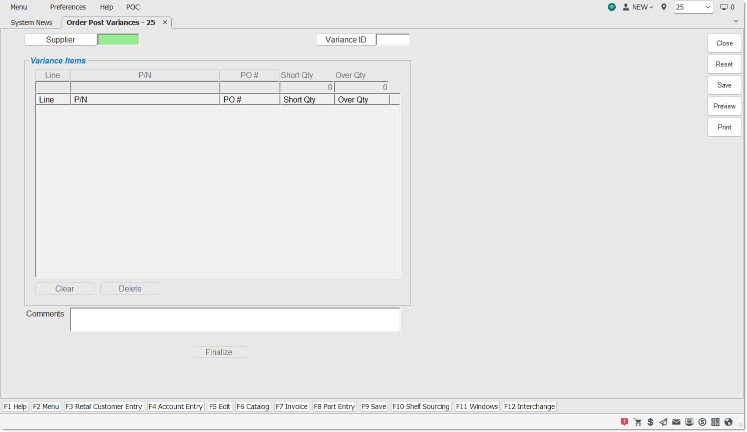 Enter a supplier value or click the 'Supplier' button to browse for a supplier value. Once a valid supplier value has been selected, the 'Line', 'P/N', 'PO #', 'Short Qty', and 'Over Qty' fields become available.