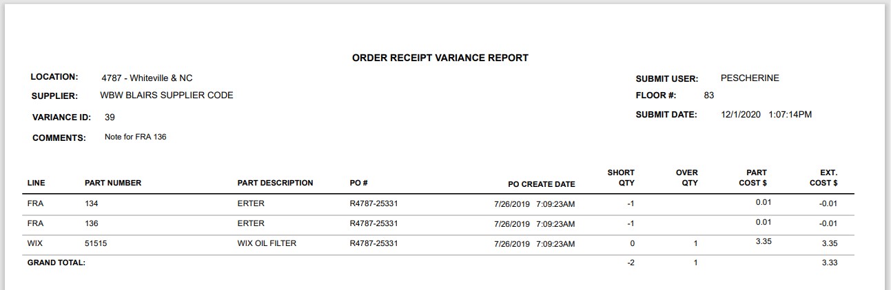 The 'Order Post Variances Report' is used to show the quantity of the variances for each part on an order. The header displays the 'LOCATION' and 'SUPPLIER CODE' that are associated with the order, the 'VARIANCE ID' of the specific instance, and the 'SUBMIT DATE', the date the 'Variance ID' was finalized.