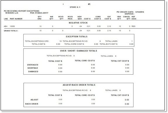 Prints the 'Adjust / Back Orders section of the 'Exceptions Report', when checked. Flag default is controlled by the value of the 'Adjust/Standing Orders' flag in the System Purchasing Setup screen, but can be edited at the time of printing. Displays and is available only for purchase order lines received from Corporate. Only the parts on the PO that have Vendor Order Adjustments or Back Orders (Standing Orders) are reported.