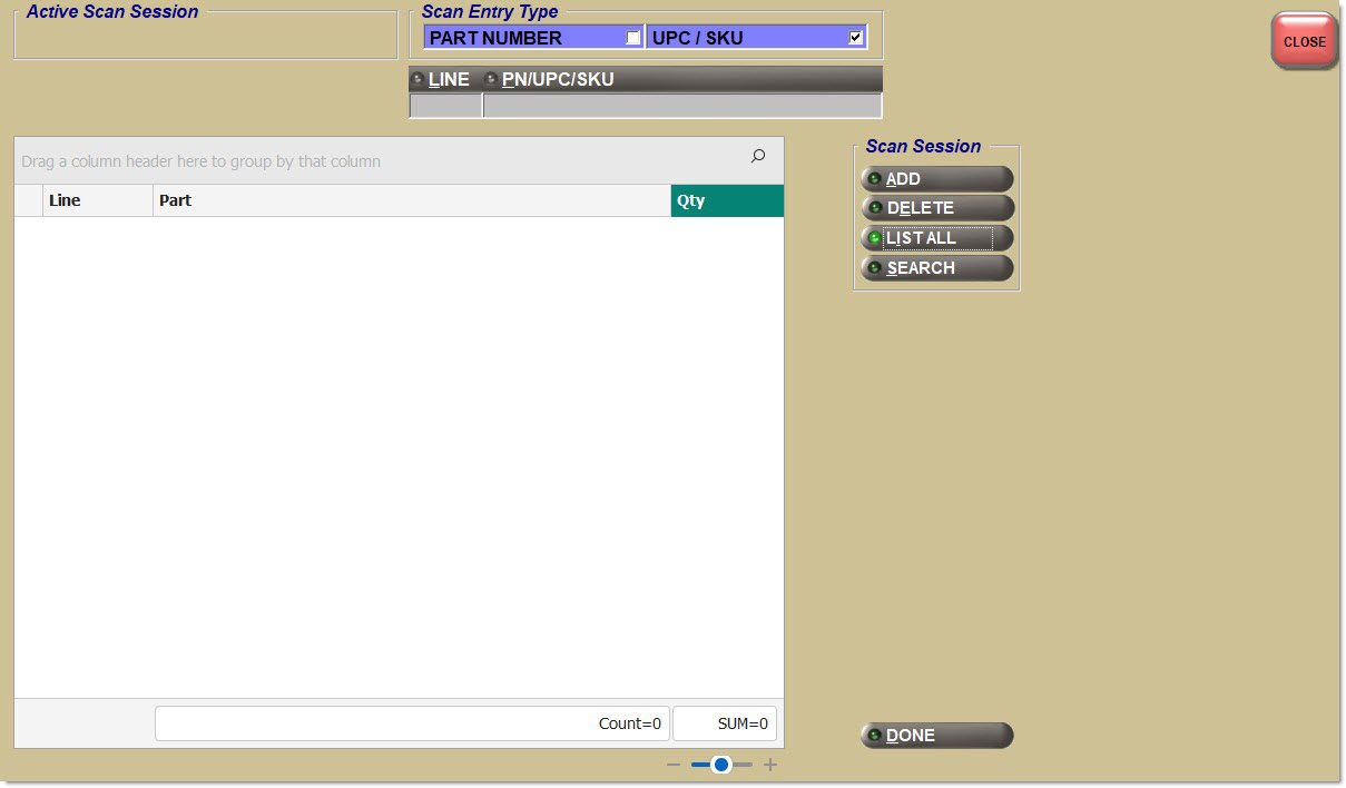 Menu Path: Purchasing, Scan Session, Scan Session screen