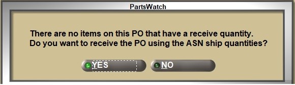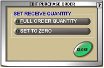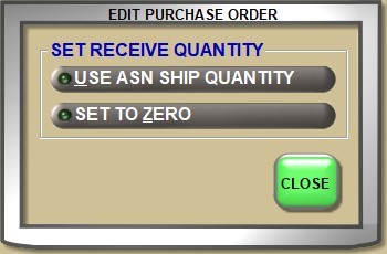 - 'SET RECV QTY' - Displays the 'EDIT PURCHASE ORDER' window to determine whether to edit the PO by setting the received quantity for all parts on the order to either the full order quantity or to zero. 'SET RECV QTY' can only be used once the PO has been finalized.