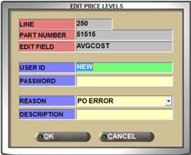 When any of the cost fields are edited, the 'EDIT PRICE LEVELS' pop-up displays and the edits are tracked to the Part Ledger Cost Edits Report.