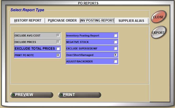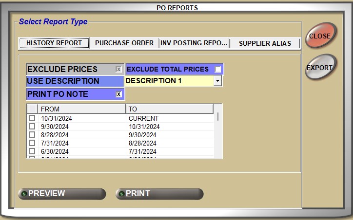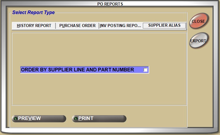 Click the 'REPORTS' button from the menu list to display the 'PO REPORTS' window. Click 'HISTORY REPORT', 'PURCHASE ORDER', 'INV POSTING REPORT', or 'SUPPLIER ALIAS'.