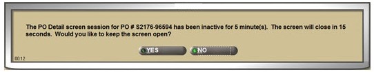 The 'PO DETAIL SCREEN INACTIVITY MINUTES' field in the SYSTEM PURCHASING SETUP screen enables the you to set the number of minutes that a PO can remain open on a user's screen and inactive before being automatically closed. When a PO is left open beyond the pre-set time, a pop-up displays to inform when the PO will close. Close the PO or keep the PO open. Once closed, the PO is available for another user to open.