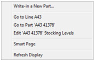 Right-click on a highlighted part on the PURCHASE ORDER screen to display the following menu.