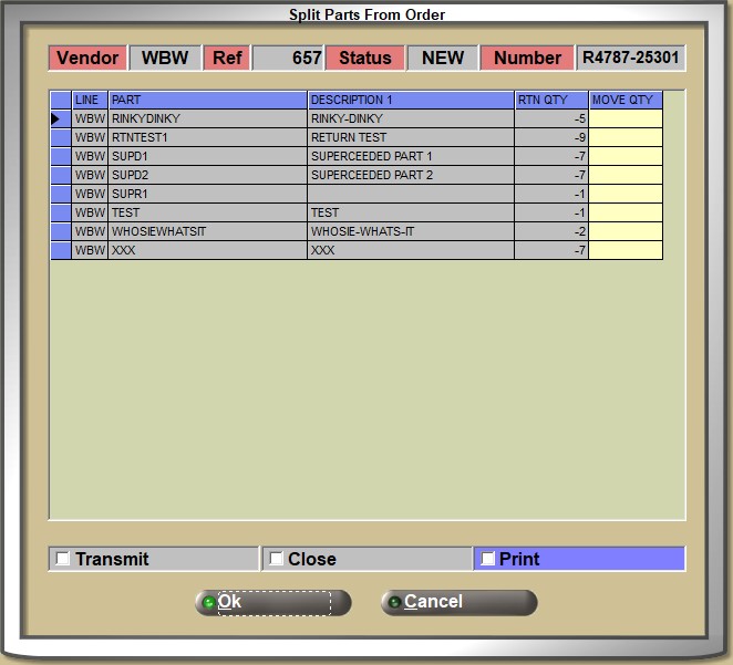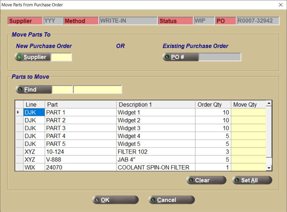 - 'MOVE' - Moves some or all parts from an existing purchase order to a new or existing purchase order for the same or different supplier. Enabled for any purchase order that is editable. POs that have already been transmitted are not editable and this button is disabled. Only visible when a PO displays, 'SPLIT' displays for Return Orders.