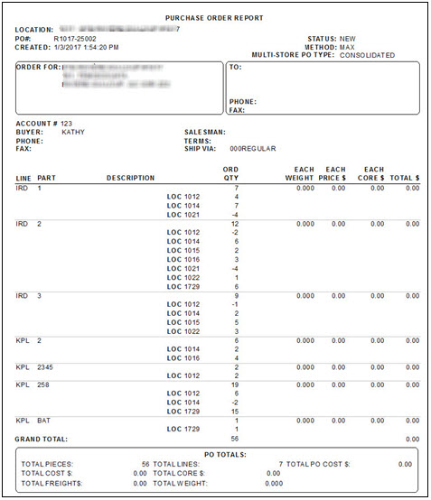 The following is an example of the Multi Store 'PURCHASE ORDER REPORT – MULTI-STORE PO TYPE: CONSOLIDATED'.