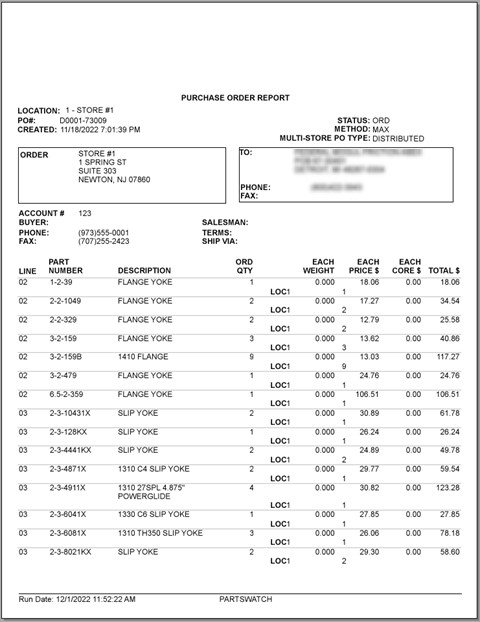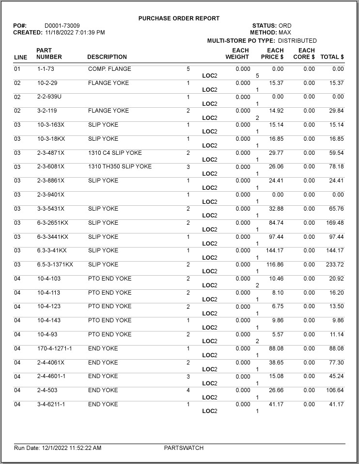 - 'LINE / PART' - Sorts items by Line and Part, and within each part shows a total 'ORD QTY' and quantities for each store.