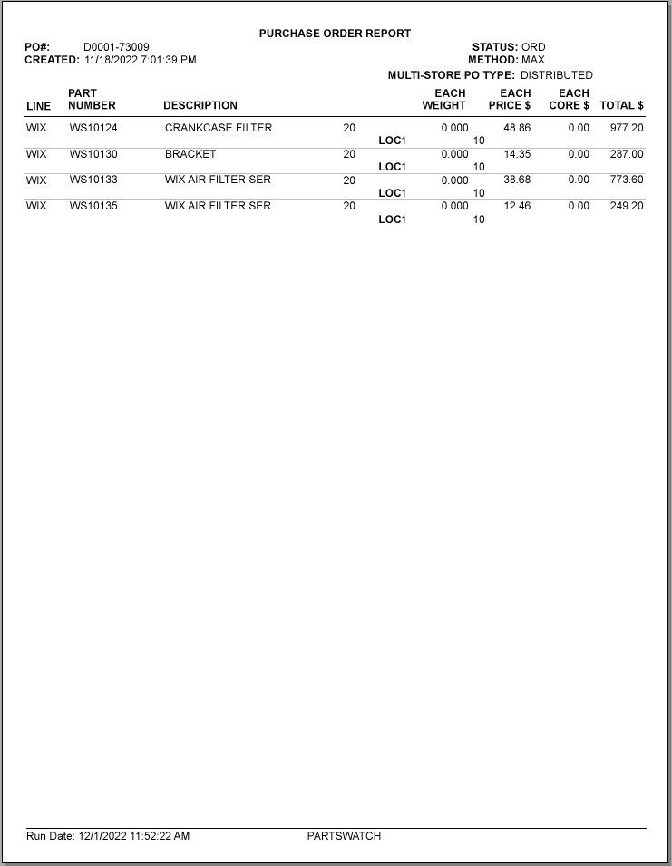 - 'INCLUDE' - Includes parts for a store even if user zeroed order quantity for that store, along with parts/stores that had a quantity.