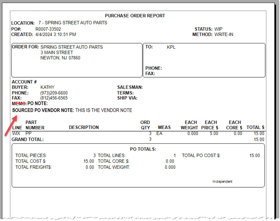 The following is an example of the 'PURCHASE ORDER REPORT' with 'PRINT SUBTOTALS' checked, and with the 'PRINT PO NOTE' and 'PRINT SOURCED PO VENDOR NOTE' checkboxes checked: