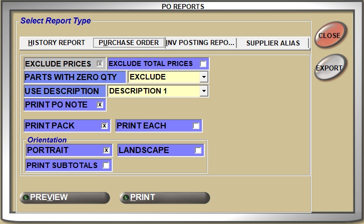 - 'REPORTS' - Displays the 'PO REPORTS' window to generate the 'HISTORY REPORT', 'PURCHASE ORDER REPORT', 'RECEIVING REPORT', and 'SUPPLIER DISCOUNT REPORT'. The 'RECEIVING REPORT' is used once received quantities are entered but before the purchase order is transferred to stock. The 'PURCHASE ORDER REPORT' is generally printed immediately after the order is created to assist with the editing procedure.