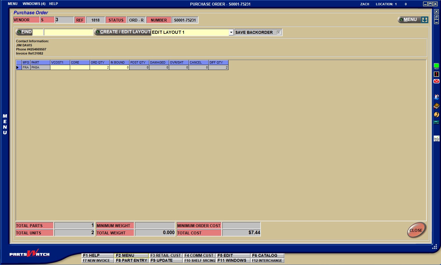 The system allows the creation of your own layout for the PO edit screen. The pre-set default layout, called 'EDIT LAYOUT 1' displays the line code (if a supplier order), current cost, core, and order quantity. If no other layouts have been created, this layout is used by default.