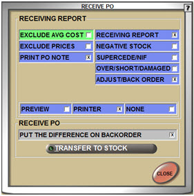 - 'RECEIVE' - Receives the order into stock and optionally prints the 'RECEIVING REPORT' and/or 'EXCEPTIONS REPORTS'.