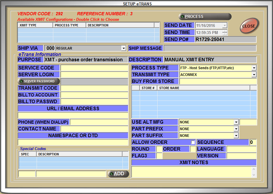 - 'PLACE ORDER' - Transmits the PO to the vendor if transmission setups have been established for the vendor in the SUPPLIER XMIT screen. 'PLACE ORDER' can only be used once the PO has been finalized and changes the status to 'ORD'. If an XMIT record has not been set up, the 'SETUP eTRANS' window displays for the user input before clicking the 'PROCESS' button to transmit the PO.