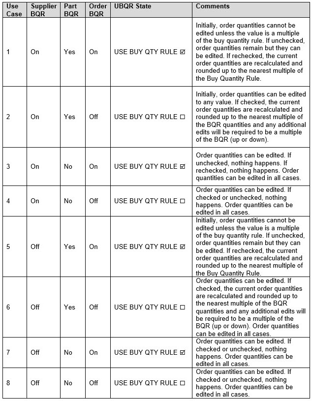 - The "UBQR State" refers to the state of the 'USE BUY QTY RULE' checkbox on the PURCHASE ORDER screen when it is initially created.