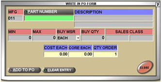 - 'WRITE-IN PART' - Allows a part to be manually added to the purchase order as long as the PO has not yet been transmitted. In-File or Not-In-File parts may be added.