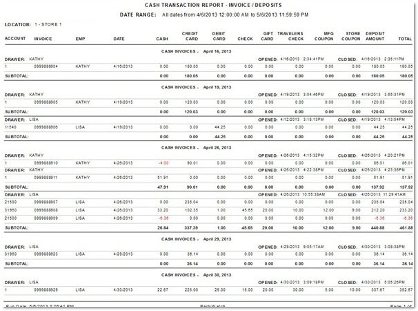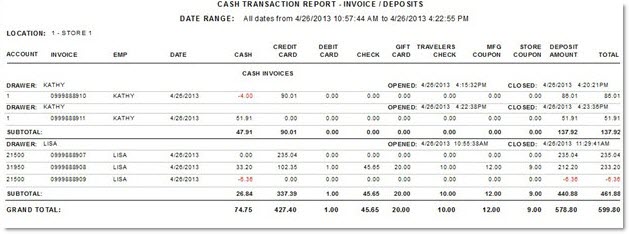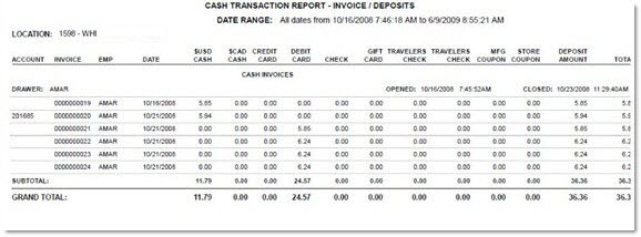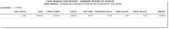 The 'Cash Transaction By Date Report' reports cash transactions by the requested date(s) of the cash drawer close, each date listed one following the other.
