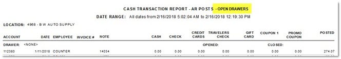 The following is an example of 'Cash Transaction Report - AR Posts - Open Drawers':