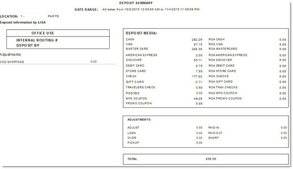 The report reflects the deposit's Adjustments, Deposit Media, Total and, Cash and Checks amount. The Cash & Checks amount is calculated as: 'Cash' + 'Checks' + 'Travelers Checks' + 'ROA Cash' + 'ROA Checks' + 'ROA Travelers Checks' + Positive 'Adjustments' - Negative 'Adjustments' (includes Adjustments of 'Cash', 'Checks', and 'Travelers Checks').