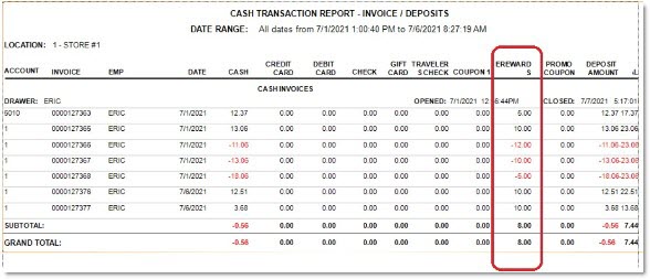 'Coupon' (Includes MFG Coupons, Store Coupons, ROA MFG Coupons, and ROA Store Coupons). If you want to view loyalty program dollars tendered (redeemed by a customer for sold merchandise or refunded back to a customer for returned merchandise) they can use the 'Coupons' selection in the 'Tender Type' drop-down. The following image displays the 'eRewards' column after a 'Coupon' selection in the 'Tender Type' drop-down in the Invoice / Deposits report.
