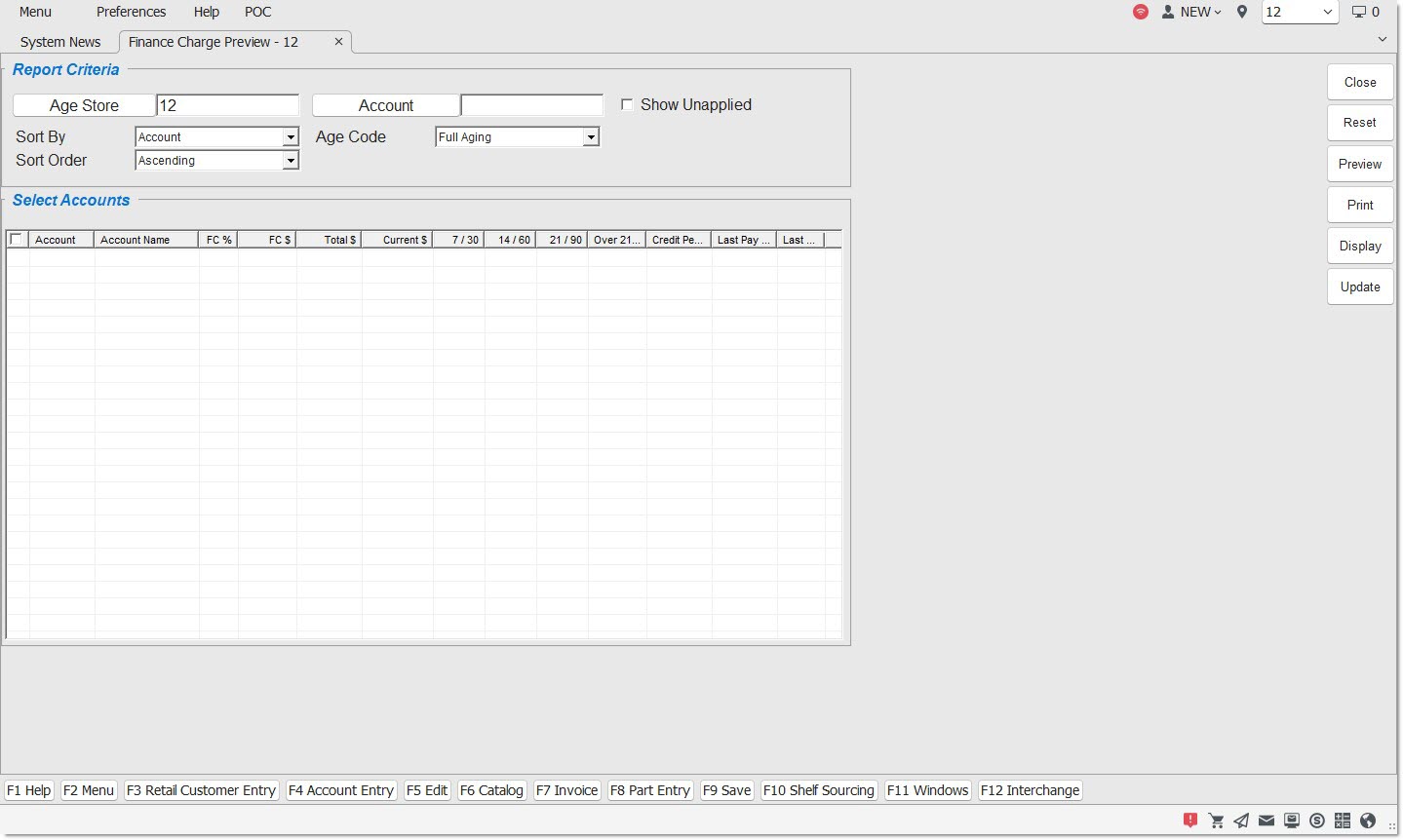 The Finance Charge Preview utility enables Independent stores to view accounts that expect to incur a finance charge on the next statement. The Finance Charge Preview screen enables the viewing of these accounts and deselecting of an account in order to waive the finance charge for the upcoming statement, when needed. The finance charge amount, however, cannot be edited. Changes can be made up until the End-of-Month is run.