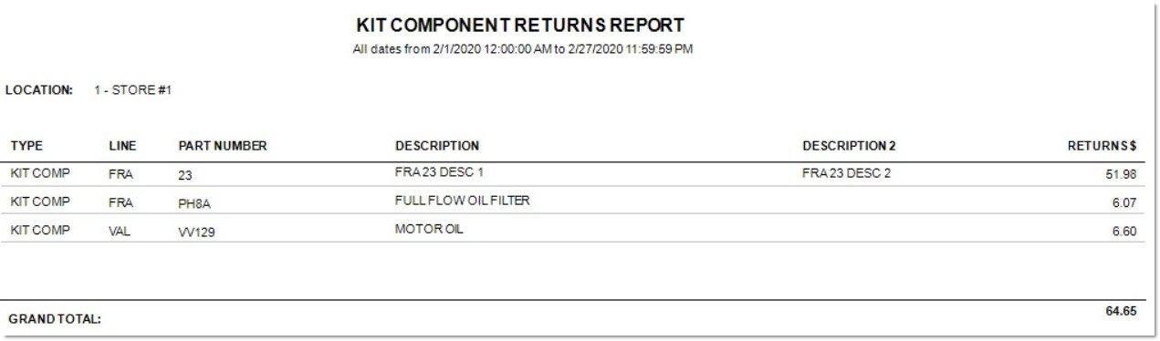 Run the 'Kit Component Returns' report, which displays an aggregation of the extended sell price for the component part returned within the specified date range for that location. Reports all component returns in the store that transacted the return regardless of the store that transacted the sale.