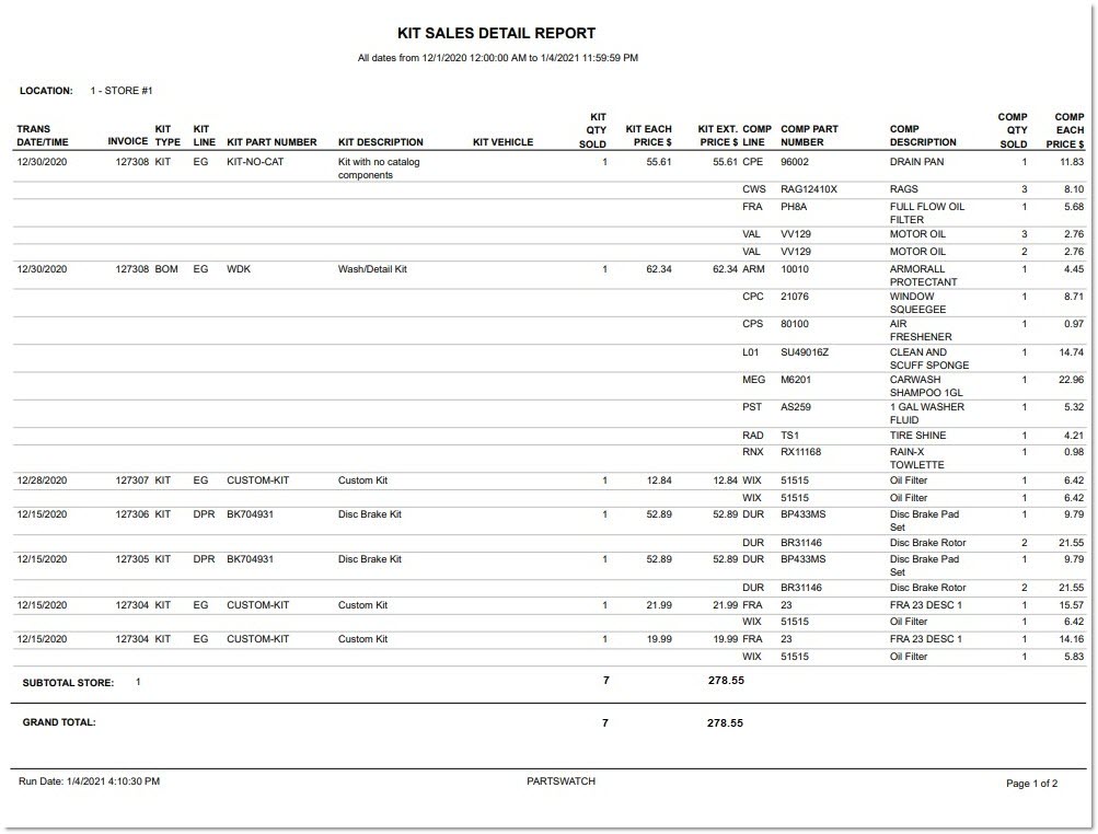 Displays the total amount of all extended sell prices for all kits sold within the specified date range for that location. Then, breaks down the kits into components and displays further information about the kit breakdown.